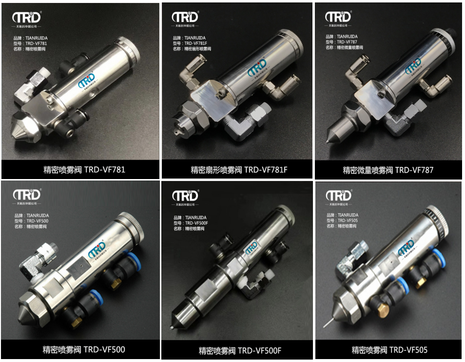產(chǎn)品介紹TRD-VF500精密噴霧閥用于涂覆、標記、粘接和潤滑等, 適用于許多中低粘度流體。是一種將液體變成細小的水珠,以噴霧形式排出的裝置,能夠可靠地噴涂以微升或毫升計量的流體。不堵塞,不滴液,不會變干,不會過度噴膠,不起霧,不跳躍。可代替人工特定的點膠作業(yè),實現(xiàn)機械自動化的生產(chǎn),高輸送效率,可極其一致的覆蓋區(qū)域。 產(chǎn)品用途 適用于催化劑、涂層、油脂、液體助焊劑\硅膠、溶劑、記號墨、油類等流體。 產(chǎn)品特點 ◆ 高輸送效率,極其一致的覆蓋區(qū)域 ◆ 能夠可靠地噴涂以微升或毫升計量的流體。不堵塞,不滴液,不會變干,不會過度噴膠,不起霧,不跳躍 ● 可調(diào)節(jié)的噴嘴壓力